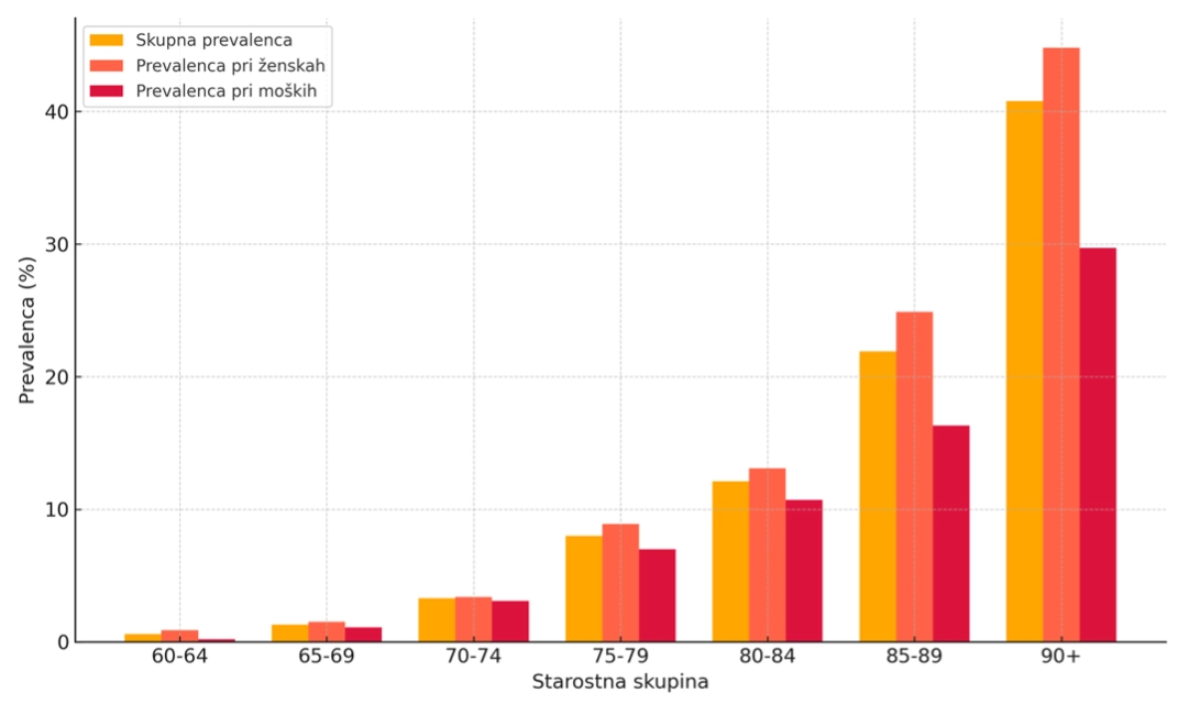 Spodnji graf prikazuje podatke o razširjenosti oziroma prevalenci demence v letu 2018. Podatki so izraženi v odstotkih za celotno populacijo ter dodatno razdeljeni po starostnih skupinah in spolu.