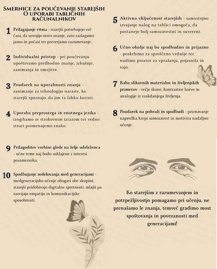 Navedene smernice temeljijo na potrpežljivosti, preprostosti in prilagajanju vsakemu posamezniku. Ko starejšim omogočimo prijazno in spodbudno učno okolje, postanejo samozavestnejši, samostojnejši in pripravljeni raziskovati svet digitalnih možnosti.