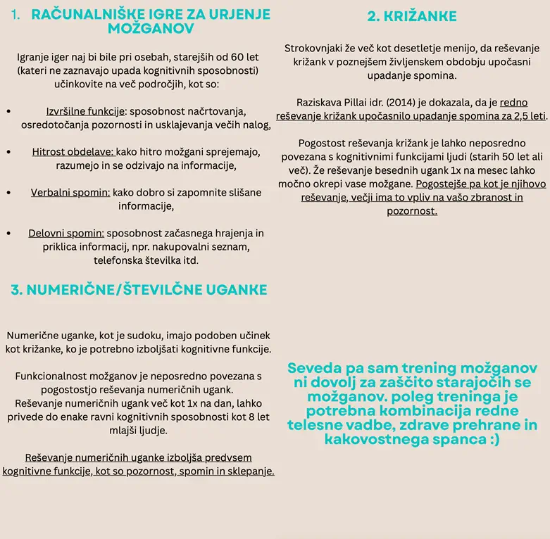 A pozor – samo možganski trening ni dovolj. Za celovito zdravje sta pomembna tudi gibanje, uravnotežena prehrana in kakovosten spanec.